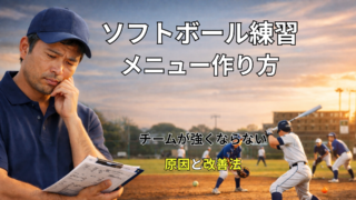 ソフトボール ソフトボール練習メニュー作り方|チームが強くならない原因と改善法 ソフトボール練習メニュー作り方に悩む指導者へ。チームが強くならない原因は、練習量ではなく「練習設計」にあるかもしれません。強いチームに共通するソフトボール指導方法や、試合につながる練習メニューの組み立て方を分かりやすく解説します。 ソフトボール
